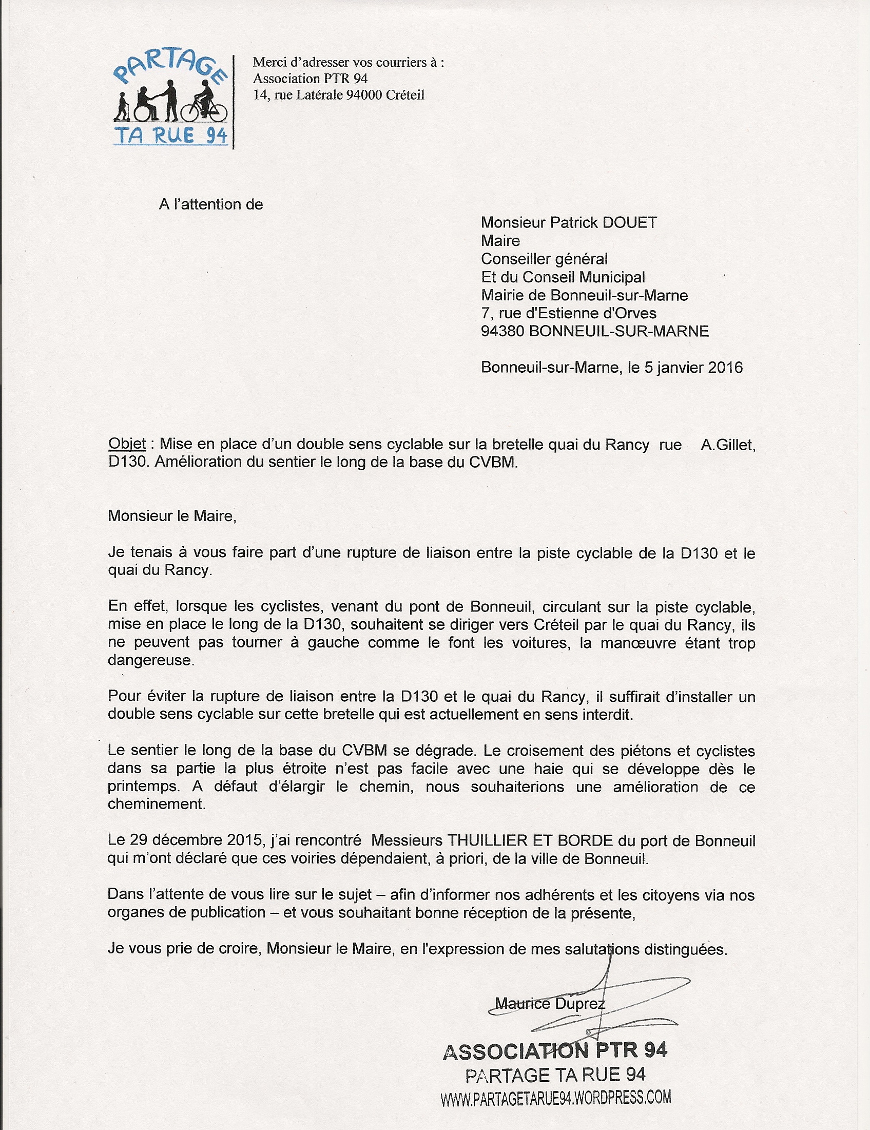 Après avoir été reçu le 9 février 2016 par M. Alain HENRY, responsable des Services techniques de la ville de Bonneuil, je suis informé, d’une part, que cette voirie n’est pas départementale, contrairement à la réception d’un premier courrier de Monsieur le maire, mais communale et que vue la difficulté technique de l’aménagement à mettre en place et la dangerosité pour les cyclistes, le DSC ne sera pas installé.