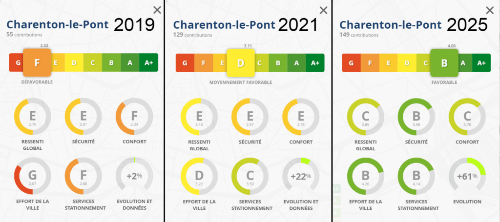 Le score global de ces trois communes a diminué depuis 2021. La ville de Saint-Maurice avait pourtant entamé les démarches pour réaliser un plan vélo en 2023 comme nous l’évoquions ici. Aucun rapport n’a cependant pas été publié par la suite et les observations remontées par les citoyens n’ont toujours pas été mises en application (comme la suppression des ralentisseurs en plastique sur le chemin du halage qui s’avèrent dangereux et très inconfortables pour les usagers).